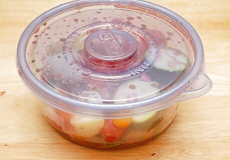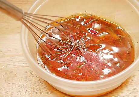 Toss the cut vegetables and the tomatoes with the marinade in a large bowl, making sure they are well-covered.