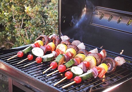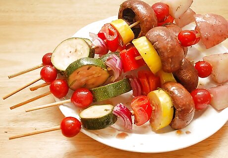 Thread your vegetables on your soaked skewers after they have soaked for 30 minutes. If you are intending to serve them on the skewers, alternate the vegetables. Leave about 1/4 inch (2/3 cm) room between each vegetable. For the most even grilling, thread the same vegetable on each skewer. Cooking times between vegetables will vary between 3 and 10 minutes. You can remove the quicker cooking vegetables and leave others on the grill.