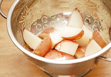 Quarter 6 small red potatoes. Boil them in a large pot of salted boiling water for 3 minutes. Rinse in cold water and drain the potatoes. Set aside to dry after they are rinsed or pat dry.