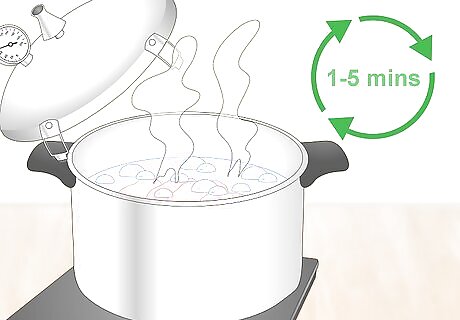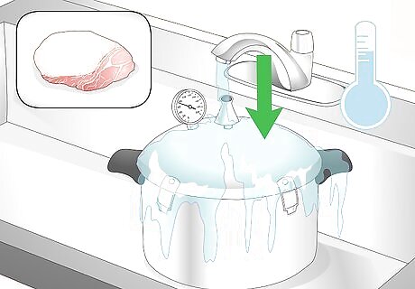 Release pressure quickly for softer foods. Some softer foods require you to remove pressure from the cooker immediately following cooking. Typically, the simplest method for quick-release pressure removal is to move the pressure cooker into your sink and apply cold water onto the top of the lid. All the pressure should release in less than 1 minute. Never submerge the pressure cooker in water during quick-release pressure removal. Ideally, use a pressure cooker with safety features that prevent you from removing the lid when there is still pressure within it. Check the owner's manual for specific instructions on quick-release pressure removal. Avoid doing this for large pieces of meat—there's a higher chance of losing nutrients through improper cooking.