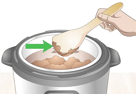 Scrape off excess browned pieces when browning food. When browning your food using the sauté function (if your cooker has it), be sure to scrape up browned pieces of food that stick to the bottom of the cooker. Apply a small amount of water or wine to discourage scorching, and loosen the browned pieces using a wooden spoon.