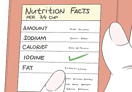 Check the labels of all the food you eat for iodine content. Always exercise diligence and investigate the food you eat. You might be surprised how many foods contain iodine. Read all the labels on food you buy, or investigate the foods online if they aren’t labeled. Cut out foods that will push you over your daily limit. If the food you’re buying isn’t labeled, try checking the National Institute’s of Health page to see if the iodine content is listed at https://ods.od.nih.gov/factsheets/Iodine-HealthProfessional/#h3.