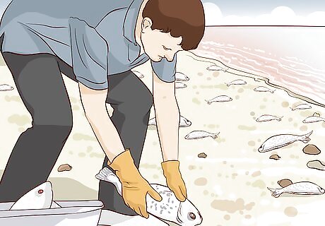 Report fish kills and distressed wildlife. If you see large quantities of dead fish or beached turtles, dolphins, or manatees, contact wildlife responders as soon as possible. Provide a detailed report about the fish or animals, including their location and appearance. If possible, take photos or videos that you can submit to wildlife responders. In Florida, you can contact the Florida Fish and Wildlife Conservation Commission (FWC) at 800-404-3922. You can also report fish kills to the FWC Fish Kill Hotline at 800-636-0511.