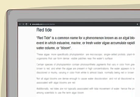 Share science-based information about red tides with friends and family. Use your social media accounts to increase awareness of red tides among people you know, especially those who live in or frequently visit coastal areas. Share science-based articles along with personal commentary on how red tides affect your local community. If you live in a coastal area, you can organize local cleanups or solicit donations to a local nonprofit organization. You could also get a group together to work on a monitoring or cleanup project. If you're a member of a church or community group, let them know how they can help with the effort to prevent red tides.