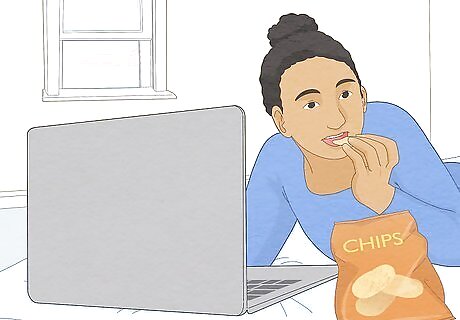 Avoid unplanned snacking between meals so you don't overeat. Plan out your meals and snacks, and eat them at the same time each day. This way, you're mindful of how much you're consuming and your body knows when to expect food. Then, your stomach will start to secrete digestive enzymes before your meals to aid your digestion, and you'll be less likely to overeat. Make a meal schedule for yourself, then stick to it.