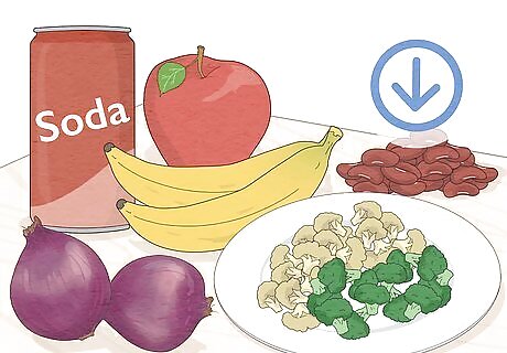 Cut back on foods that make you feel gassy. Gas is another cause of stomach discomfort, so avoiding foods that cause it can help you prevent a stomach ache. Although you don’t want to eliminate these foods altogether, eating less of them can help. Eat less of the following foods, which often cause gas: Carbonated drinks. Beans and legumes. Dairy. Veggies like cabbage, broccoli, Brussels sprouts, asparagus, cauliflower, onions, and potatoes. Fruits like cucumber, prunes, raisins, apples, and bananas. Fried foods.