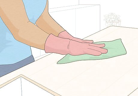 Keep your kitchen and dish towels clean. Wipe your countertops with hot, soapy water or a disinfectant. Similarly, clean your sink daily with hot soapy water or a disinfectant. Replace your kitchen towels and dish rags daily. If you use a sponge, wash it with hot water and soap, and switch out your sponge at least twice a month. Your kitchen surfaces and towels can become contaminated with germs that cause food poisoning, especially after cooking.