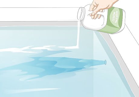 Lower the chlorine levels with a chlorine neutralizer. If you add too much chlorine or shock to your pool, you can easily lower it with a chlorine neutralizer, available at pool supply stores. Follow the instructions on the package to find out how much to add based on the size of your pool and how high the chlorine levels are. Then, pour the liquid into the pool while the pump is on and let it disperse.Variation: The sun naturally breaks down chlorine, so if the chlorine levels are less than 5 ppm, simply stay out of the pool for a few days and let the sun do its job. Or, you can drain some water and replace it with fresh water to dilute the pool. Just be sure to do a water test before swimming to ensure the chemicals are within acceptable levels.