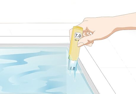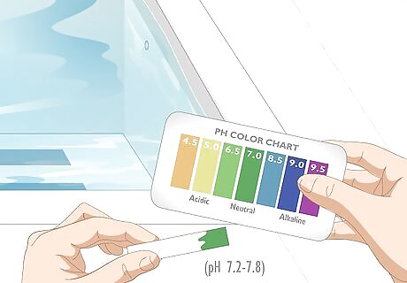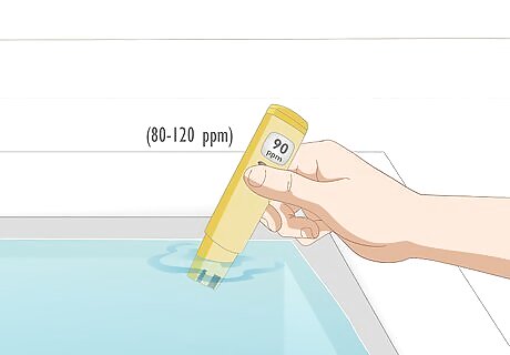 Ensure the alkalinity is between 80 and 120 ppm. Alkalinity buffers the pH and can prevent large increases or decreases in the acidity and basicity of the water. Test and adjust the alkalinity before adjusting the pH. If the alkalinity is too low, mix baking soda with water and pour the mixture into the pool to increase it. If the alkalinity is too high, adjust it along with the pH using muriatic acid.Tip: Add 1.5 pounds (0.68 kg) of baking soda to a 10,000 US gal (38,000 L) to raise the alkalinity 10 ppm.