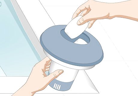 Put the chlorine tablets in a floating chlorine feeder. Read the packaging on the tablets to find out how many to use based on the existing chlorine levels in the water and the size of your pool. Put the tablets in a floating chlorine feeder and put the feeder in the pool. As the feeder floats around, the chlorine will gradually dissolve and be distributed throughout the pool water. Instead of a floating feeder, some pools have a skimmer basket that hooks on the side of the pool. If your pool has this, drop the chlorine tablet right into the basket. Skimmer baskets are commonly used with above-ground pools. Other pools come equipped with chemical feeders. Chemical feeders slowly meter out precise amounts of chlorine into your pool water automatically and offer very precise control over the amount of chlorine being added to the swimming pool. If a feeder is adjusted properly, you may not have to worry about your chlorine level for a week or more.
