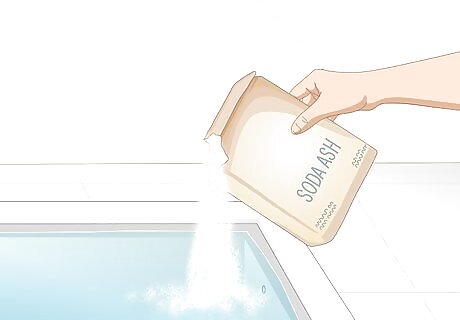 Increase the pH with soda ash. Soda ash (AKA sodium carbonate) can easily raise the pH and total alkalinity of your pool water. In general, plan to use 6 ounces (170 g) of soda ash per 10,000 gallons (38,000 L) to raise the pH by 0.2. Pour the soda ash into a clean bucket then fill the bucket with water and mix the soda ash into it. Then, spread the mixture around the perimeter of the pool. Ensure the pump is on so the soda ash dissolves and gets evenly distributed.