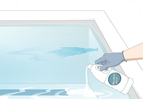 Lower the pool’s pH levels using muriatic acid. Find muriatic acid (AKA hydrochloric acid) at a pool supply store. Read the packaging to determine how much to add to your pool to lower the pH to an acceptable level. Pour the muriatic acid directly into the deep end of the pool while the pool pump is on and the water is circulating. Retest the water after about 6 hours of continuous filtration and readjust the pH as needed. This will prevent “bouncing,” which occurs when the pH levels switch between being high and low. Warning: Wear long-sleeved clothing, pants, close-toed shoes, gloves, goggles, and a respirator or mask when working with muriatic acid to prevent irritation to your skin, eyes, or lungs.
