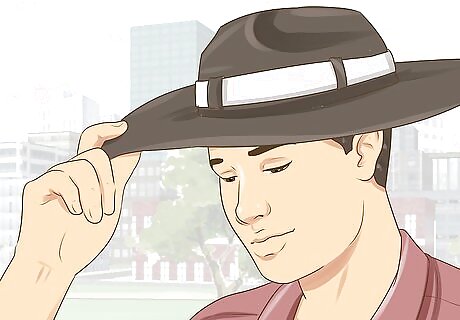 Wear a hat. Even on cloudy days, ultraviolet (UV) light can still cause sunburns and damage skin. The easiest way to protect your head is to cover it with a cap of some sort. If possible, wear a wide-brimmed hat that protects your neck, as well. A hat is less effective than sunscreen (roughly equivalent to SPF 5), but it protects your scalp and other areas where sunscreen is difficult to apply. If you do not have hats available, walk in such a way that minimizes your exposure to the sun. For instance, walk on the shady side of the street instead of the sunny side, or choose a path that keeps you beneath the shade provided by trees.