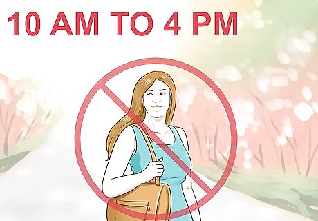 Avoid going out when the sun is most intense. The midday (10 AM to 2 PM) sun is the worst for your skin. Try to avoid going out during these times. If you do, cover your hair and head with a hat, or seek shade beneath a stand of trees to maximize hair and scalp protection.