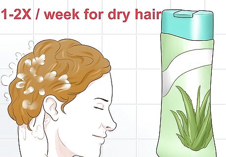 Adjust your shampooing schedule. Clean hair is stronger, more resistant to sun-related damage, and less likely to leave your scalp exposed. However, washing your hair more often than necessary can dry out your hair, making it weak and brittle. Daily shampooing is only necessary if you have very fine or oily hair, or if sweat has a noticeable daily effect on your scalp. Thick, dry hair may only need washing once or twice a week. Wash with warm water instead of hot. Use a mild, sulfate-free shampoo made with natural ingredients like shea butter, argan oil, tea tree oil, and aloe vera. Once you’re done in the shower, avoid using lotions and styling gels. This will allow your hair to retain its natural oils, keeping it strong, healthy, and less likely to suffer sun-related damage.