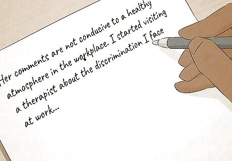 Write down how the discriminatory words or actions affected you. If you're being harassed, whether by higher-ups or by coworkers, it can have a significant impact on your mental health and your work. You might find yourself dreading to go to work or feeling less motivated to follow the rules or perform your best. Keeping a diary of your thoughts and feelings will help prove the discrimination and the impact it had on you. For example, if you feel that your supervisor is racist, it might make you unwilling to go the extra mile for them or put in more than the bare minimum effort. If you end up filing an administrative claim or lawsuit, direct evidence of your feelings can be very powerful. If you've visited a therapist or talked to another professional about the discrimination you face at work, keep records of that in case you file a discrimination claim. They can help prove the damages the discrimination has caused.