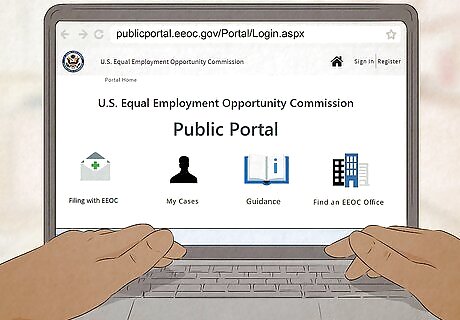 Forward your complaint to the EEOC. If you file a complaint with your state agency, they'll automatically forward it to the Equal Employment Opportunity Commission (EEOC), the federal agency that handles discrimination claims. You can also file with the EEOC first. Go to https://publicportal.eeoc.gov/Portal/Login.aspx to get started. After you file your complaint, an EEOC agent will contact you for an interview. They'll likely ask you what would make the situation right for you or what you're looking to get out of it, so be thinking about it and be ready for that question. During the investigation, the agent will talk to other people you work with, including the person you allege discriminated against you, and try to work out a resolution to the problem. If you aren't able to come to an agreement, the agent will give you a letter that gives you the right to sue.