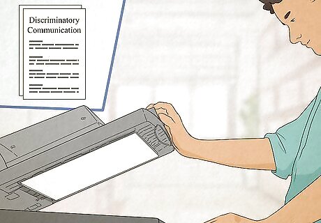 Make copies of discriminatory communications. If you're lucky enough to find anything in writing that's racially discriminatory, those documents can be used against your employer to prove discrimination. While it's highly unlikely that you'll find this sort of evidence, it is some of the strongest evidence to have. For example, suppose your immediate supervisor sent an email to another employee in which they stated that the only reason they wrote you up for a dress code violation was that you were Hispanic. That would be direct evidence of racial discrimination. Employers might also use codes that really mean to exclude or segregate employees of a particular race. For example, an employer could mark résumés with letters that seemed innocuous, but were really intended to identify the candidates of a particular race so they wouldn't be hired.