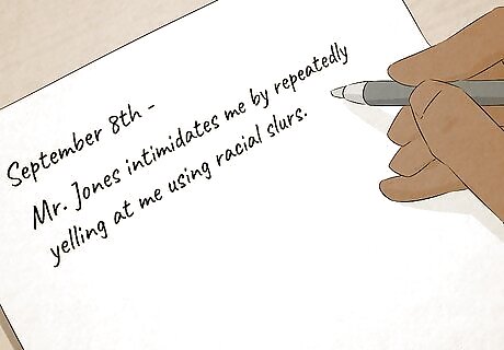 Keep a written log to record a pattern of discriminatory harassment. From the first moment you believe that you're being discriminated against, start a log. Write down the date, time, and location of every incident, along with a brief description of what occurred. Whenever you face discrimination, you're always the first witness, so your account is important evidence. Include the full name and job title for anyone there when the discrimination occurred, including the person responsible for the discriminatory behavior. You might also note how the acts or comments made you feel or how you reacted.