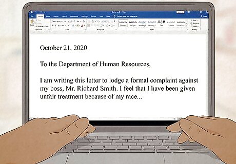 Submit your complaint to your state agency. If you aren't satisfied with what happens after you report the discrimination at work, you can file a complaint with your state agency and let them investigate the issue. Look up your state's agency online — their website will have more information about how to submit a complaint. Not all states have an agency, so if you don't find one, go ahead and file a complaint with the federal agency instead. Your complaint has to be in writing and include the name and address of the place where you work. You'll also need to include your full name, address, and phone number. An agent will be in touch with you about your complaint within a couple of weeks after you submit it. Some states require you to sign your complaint in the presence of a notary. Most states have a form you can use to organize your complaint. You don't necessarily have to use the form, but it can help you make sure you've included all the information they need.