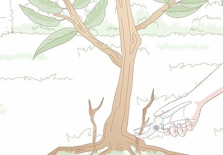 Cut out suckers that grow near the bottom of the trunk. Suckers are small branches underneath the main branch system of the tree. Cut suckers back to the branch collar at a 45° angle using your pruning shears. Suckers sap nutrients from the fruit-bearing branches at the top. Over time, they can keep your tree from fruiting.