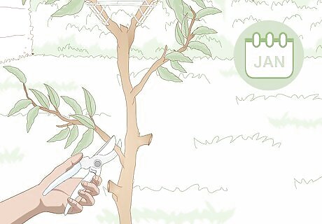 Prune new branches in January. Prune lateral branches (branches that grow out from the scaffold branches) back to the branch collar using cuts made at 45° angles. You should prune young trees fairly heavily for the first 3 years so that they distribute less nutrients for fruiting growth and more for vegetative growth. Pruning vertical branches helps to encourage vegetative growth, pruning horizontal ones helps to encourage fruiting growth. Leave small horizontal branches intact for future fruiting growth, but cut longer ones to prevent short-term fruiting. Focus on pruning higher branches to evenly distribute sunlight to lower ones. Don’t prune branches in the spring or summer. It can remove leaves that help to not only supply the tree with sunlight, but protect the tree from too much sunlight as well.