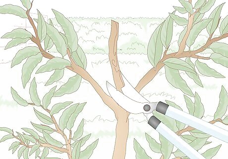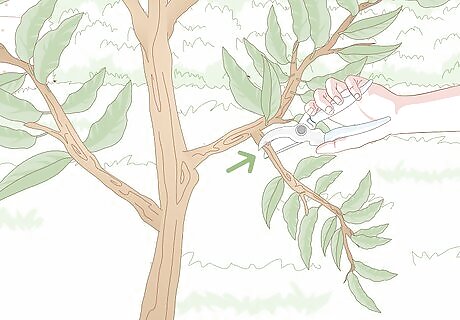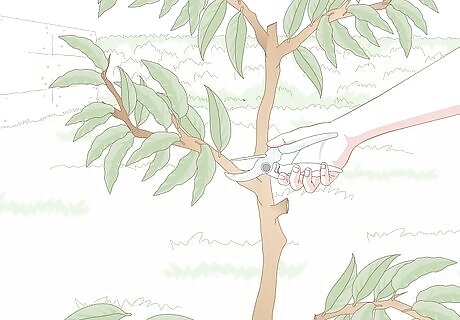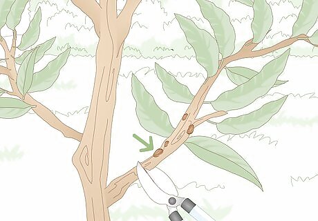 Cut out branches that show signs of gumming. Gumming is hardened sap that oozes from lesions or cankers on the tree. It is an early indication of disease. Cut out any branches showing signs of gumming by making a 45° angle cut at the branch collar. If you mow around the tree, be careful not to nick the leader. Gumming occurs at the site of open wounds on the tree, and gumming on the leader can be hard to remove.