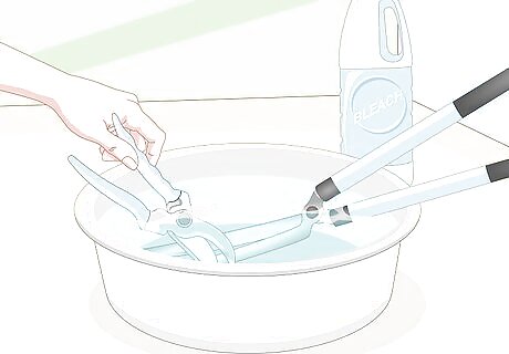 Sterilize your pruning tools. Soak your pruning tools in a solution of 1 part chlorine bleach to 9 parts water for 30 minutes to prevent the spread of plant pathogens to your tree. Do this before every pruning. The effectiveness of the chlorine bleach-water solution is halved within two hours. Make a new batch for every sterilization.