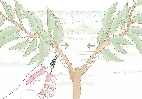 Use wooden slats and wire to form the scaffold branches into a Y-shape. Align the wooden slats along the two scaffold branches and attach them with wire. Then stretch wire between the two branches to hold them in the desired Y-shape. Make sure not to attach the wire too tightly to the branches. Doing so can inhibit branch growth.