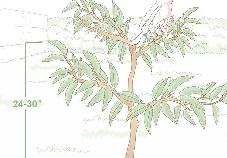 Cut the leader (trunk) to a height of 24–30 inches (61–76 cm). Cut the leader at a 45° angle with your lopping shears. This helps to encourage lower branching and will force the tree to distribute nutrients more equitably between the top and root system. Paint the leader with white latex paint to protect it from too much sunlight or insects.