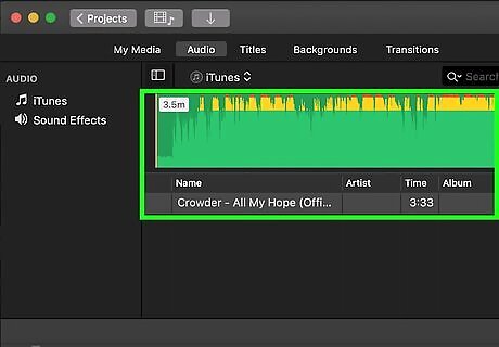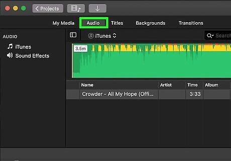 Click on Audio. This is in the menu across the top of the iMovie window. It will take you to the audio files you have available to use in your videos.