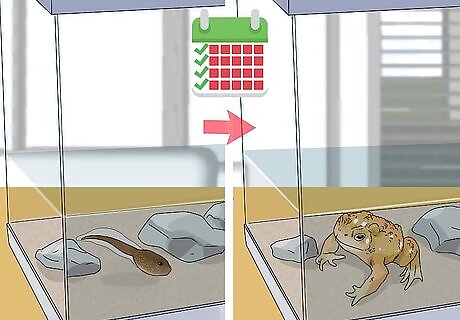 Keep the tadpoles for at least 4 weeks until they turn into toads. Watch the tadpoles carefully during the 4th week that you have them. During this week they will likely start sprouting limbs and turning into toads. Tip: 4 weeks is the average time it takes a tadpole to turn into a toad, but it can vary depending on the species of toad. The closer they are to becoming toads, the more the tadpoles will hang out around the edges of the rocks and sticks you put in their container. Once they turn into toads, their gills will stop working and they will climb up onto the rocks and sticks to hang out.