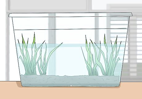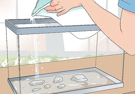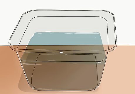 Fill a shallow container with fresh pond water. A good rule of thumb is 1 L (0.26 gallons) of water per tadpole you want to raise. Use a bottle, or another sealable container, to scoop water out of a pond and bring it home. The water needs to be shallow enough that you will be able to place rocks and sticks so they are raised above the water. Use pond water from the same pond you plan to get the tadpoles if possible. If you cannot get pond water, then boil tap water to kill any chemicals used to treat it. Let it cool completely before putting any tadpoles in it. Do not use unboiled tap water or hose water because the chemicals used to treat it can kill the tadpoles.