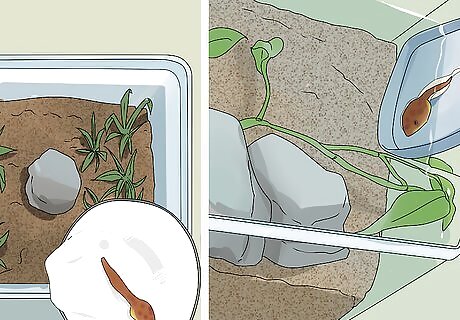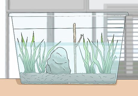 Put 1 rock or sticks in the container for each tadpole you are going to raise. Carefully place the rocks and sticks so that they are above the water. Each tadpole will need a natural surface to climb up on as they turn into frogs. Collect rocks and sticks from around a pond, if possible, so that you can recreate the tadpoles' natural environment as closely as possible.