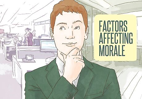 Attend to the factors at play. There is more than just one piece of the employee morale puzzle. If you attempt to solve a morale problem by thinking about it from just one angle, you won't have a clear picture of the problem. Think about the different elements that can contribute to employee morale. Attitudes of executives and managers towards subordinates. Working conditions, including pay hours of work and safety rules Effective leadership and an intelligent distribution of authority and responsibility in the organization The design of the organization’s structure which facilitates the flow of work The size of the organization.