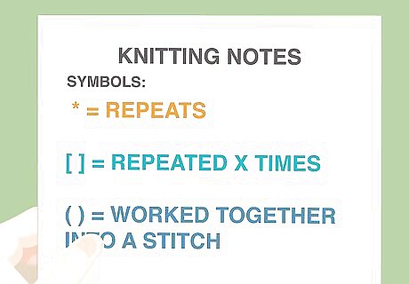 Understand the meaning of symbols. Follow the meanings of the following symbols, which will appear between other terms and abbreviations to indicate actions: An asterisk (*): Placed before an instruction that should be repeated (rep). A comma (,): Separates two different steps in the knitting pattern. Brackets [ ] / Parentheses ( ): Indicate a section of the instruction to be repeated (rep) a certain number of times.