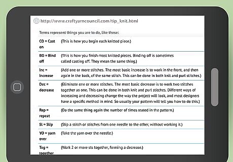 Understand written terms and abbreviations. Follow the meanings for these phrases when they appear: As established: Continue to knit the center part of a pattern that you have already set up (the pattern may call for adding or subtracting stitches at either end of the center pattern). BO: Bind off (aka cast off) to finish your knitted piece. CO: Cast on to begin knitting the pattern with a certain number of stitches. Dec: Decrease, or eliminate one or more stitches by working two stitches together as one, or another method that your pattern will specify. Inc: Increase, or add one or more stitches by working the front and then the back of the same stitch, or another method that your pattern will specify. K: Knit a knit stitch. P: Knit a purl stitch. Rep: Repeat the preceding instruction the given number of times. RS: Right side, meaning the outside or side that people will see when the item is worn. Sl: Slip one or more stitches from one needle to the other. Sts: Stitches. Tog: Work two or more stitches together. Work even: Continue knitting as you have been, without increasing or decreasing stitches. WS: Wrong side, meaning the inside or side that people will not see when the item is worn. YO: Yarn over, meaning take the yarn over the needle.