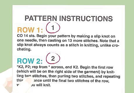 Follow the instructions for one row at a time. Use the given written instructions and symbols together to knit each row of the pattern. For example, the pattern could read: CO 14 sts. Begin your pattern by making a slip knot on one needle, then casting on 13 more stitches. Note that a slip knot always counts as a stitch in knitting, unlike crocheting. Row 1 (RS): *K2, P2; rep from * across, end K2. Begin the first row (which will be on the right side of the garment) by knitting two stitches, then purling two stitches, and repeating this sequence until the final two stitches of the row, which you will knit. Row 2 (WS): *P2, K2; rep from * across, end P2. Begin the second row (which will be on the wrong side of the garment) by purling two stitches, then knitting two stitches, and repeating this sequence until the final two stitches of the row, which you will purl.