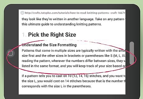 Search for a knitting pattern. Check out crafting or sewing stores or look online for a knitting pattern of your choice to start reading the pattern and embark on the project. You’ll find knitting patterns in the yarn section of a craft store, or near the sewing patterns or other guides. Look out for knitting patterns of different difficulty levels (easy, intermediate, difficult) depending on your experience and knitting ability. If you find your knitting pattern online, you may want to print it out to easily refer to it throughout your project.
