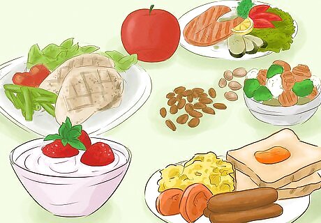 Eat a healthy diet. Eat a satisfying breakfast, but don't eat too much. Make fruits and whole grains the foundation of your healthy breakfast. Later in the day, eat light meals consisting primarily of fruits, vegetables, whole grains, and small portions of lean protein. Avoid processed foods heavy in salt, sugar, and fat. Integrating ginger into your diet can relieve nausea.