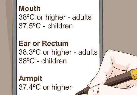 Take your temperature. A fever is one of the most common symptoms of the flu, and rarely occurs with the common cold. Measure your temperature using a home thermometer, or visit a doctor to have your temperature taken there. The average healthy body temperature is 98.6ºF (37ºC) when measured orally (by mouth), but it's normal for this to vary by 1ºF (0.6ºC) in either direction. The temperature reading that is considered a fever depends on your age and which type of thermometer you use: Mouth: 100.4ºF (38ºC) or higher for adults, 99.5ºF (37.5ºC) for children Ear or Rectum (bottom): 101ºF (38.3ºC) or higher for adults, 100.4ºF (38ºC) for children Armpit: 99.4ºF (37.4ºC) or higher. This is a less accurate method of measurement.