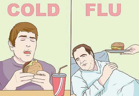Look at your eating habits. Have you noticed any changes in appetite? With a cold, you will still want food. Your eating habits will only change slightly, if at all. With the flu, however, you may notice you're uninterested in food altogether. You may have no desire to eat while symptoms persist.
