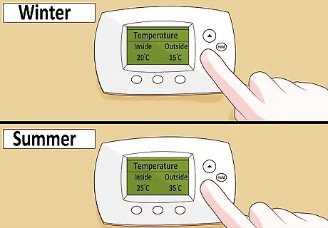 Adjust your thermostat based on the temperature outside. It’s most efficient to keep the temperature in your house between 77 and 80 °F (25 and 27 °C) in the summer. Lower your thermostat to between 64 and 68 °F (18 and 20 °C) in the winter. Keep your windows covered during summer days to keep out the heat and allow natural light in during winter days to heat up the room.