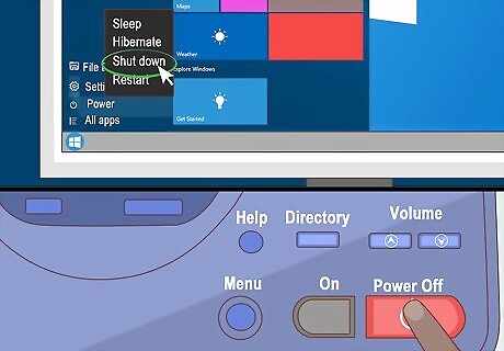 Shut down all equipment at the end of the day. Turn off copiers, fax machines, computers, and other electrical equipment every night when you leave the office. Don’t forget to turn off the lights in bathrooms, meetings rooms, and offices. Gently remind your coworkers to do the same. You should also do this when leaving for the weekend or vacation. Say something like: "These computers use a lot of energy when we aren't using them. Let's try turning them off for the night to save energy and electricity bills."