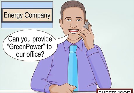 Ask your supervisor about switching to GreenPower. GreenPower is a program offered by some energy providers to reduce your home or office’s carbon footprint in Australia, the United States, and Canada. GreenPower providers are part of a government accredited program to use clean, renewable electricity in homes and offices and to reduce greenhouse gas emissions. Your supervisor can contact your office’s energy company and ask them if they can provide GreenPower to the office to reduce the office’s energy consumption on a daily basis.