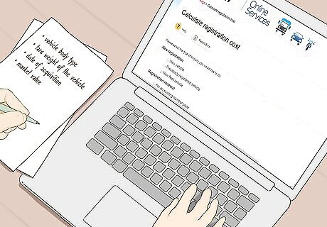 Estimate the total cost of taxes and registration fees. When you register your car, you'll pay registration fees as well as stamp duty. You can use the RMS online calculator at https://www.service.nsw.gov.au/transaction/use-vehicle-registration-calculator to estimate your total cost. Before you use the calculator, gather the following information about your vehicle: Vehicle body type Tare weight of the vehicle Date of acquisition Market value or purchase price of the vehicle (whichever is higher)