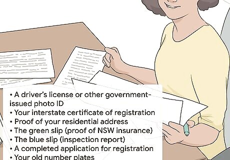 Organize documents related to your identity and ownership of the vehicle. When you go to the registry or Service NSW location to transfer your interstate registration to NSW, you'll need to show your driver's license and other documents to prove that you live in NSW and are entitled to register the car. Documents you'll need include the following: A driver's license or other government-issued photo ID Your interstate certificate of registration Proof of your residential address, such as a lease or real estate contract The green slip (proof of NSW insurance) The blue slip (inspection report) A completed application for registration Your old number plates, if you're not allowed to keep them