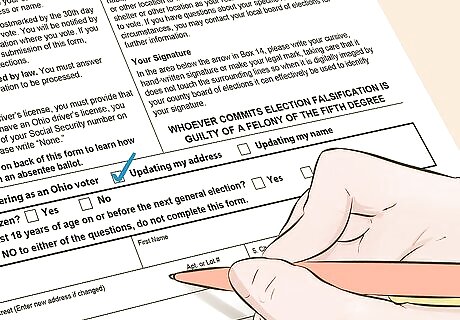 Mail or deliver the form to your local county board of elections. Once you’ve completed the paperwork, stick it in an envelope and mail it to your home county’s board of elections office. Or, if you prefer to deliver it in person, visit the board of elections and give your form to a voter-registration employee. Find your county’s board of elections online at: https://www.sos.state.oh.us/elections/elections-officials/county-boards-of-elections-directory/. Make sure that the paperwork is at the elections office at least 30 days before the next election so your registration is changed in time for you to vote.