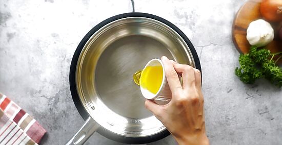 Heat a couple tablespoons of oil in a skillet. Time this so while the oil is heating, you can take the steaks out. Pat them dry with a paper towel and set them aside. The oil is ready when it starts to smoke.