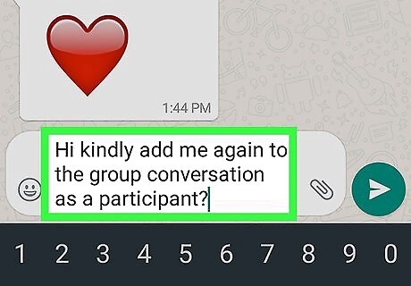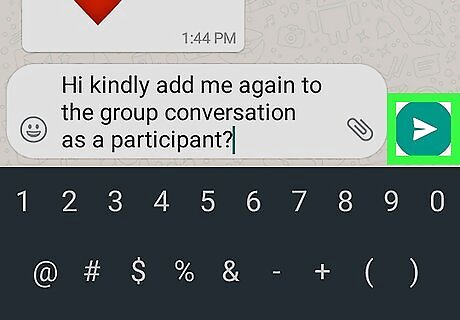 Type your message. In your message, kindly ask the group admin to add you to the group conversation as a participant. The group admin may or may not decide to add you the group at their own discretion.